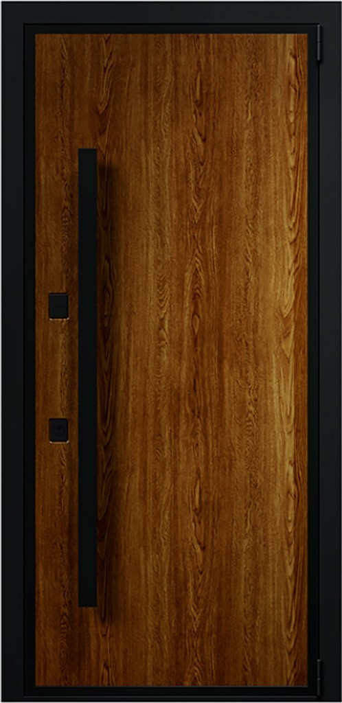Уличная дверь с длинной ручкой во всю высоту полотна в современном стиле. Входная дверь с терморазрывом и термокабелем защищена от промерзания и образования наледи. Максимальная степень взломостойкости дополнена удобством электромеханического замка. Эмалевая отделка защищена металлическим уголком от сколов. Доступны нестандартные размеры и индивидуальные конструкции для широкого проема коттеджа и загородного дома.