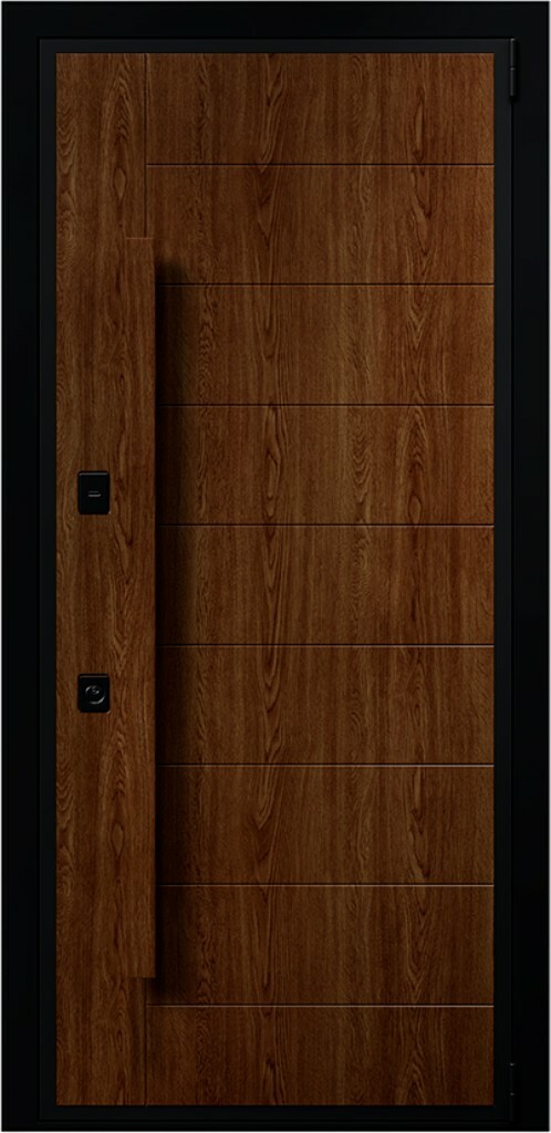 Уличная дверь с длинной ручкой во всю высоту полотна в современном стиле. Входная дверь с терморазрывом и термокабелем защищена от промерзания и образования наледи. Максимальная степень взломостойкости дополнена удобством электромеханического замка. Эмалевая отделка защищена металлическим уголком от сколов. Доступны нестандартные размеры и индивидуальные конструкции для широкого проема коттеджа и загородного дома.