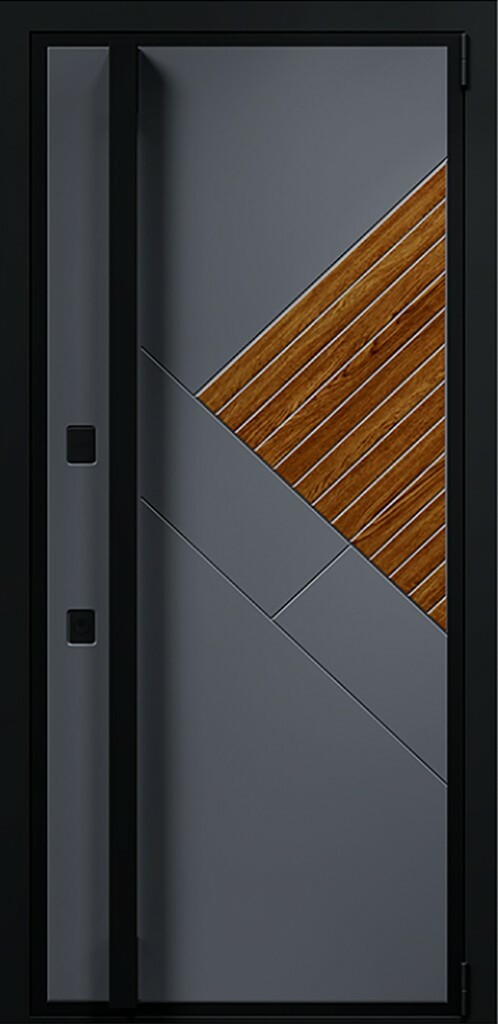 Уличная дверь с длинной ручкой во всю высоту полотна в современном стиле. Входная дверь с терморазрывом и термокабелем защищена от промерзания и образования наледи. Максимальная степень взломостойкости дополнена удобством электромеханического замка. Эмалевая отделка защищена металлическим уголком от сколов. Доступны нестандартные размеры и индивидуальные конструкции для широкого проема коттеджа и загородного дома.